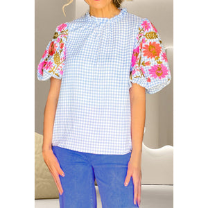 Embroidered Plaid Round Neck Short Sleeve Blouse