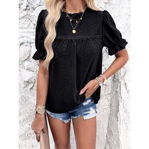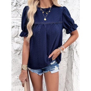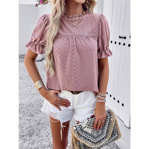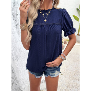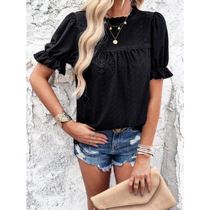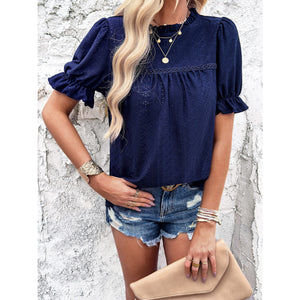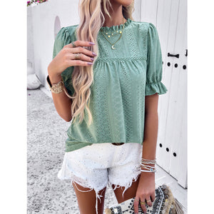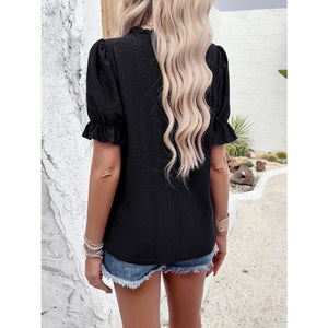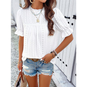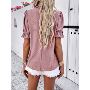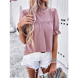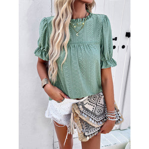 Eyelet Mock Neck Flounce Sleeve Blouse