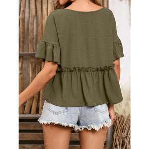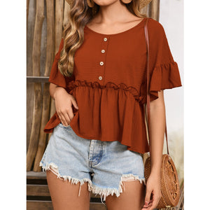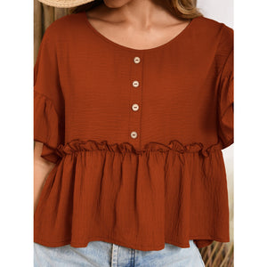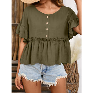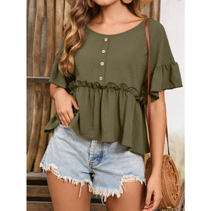 Frill Decorative Button Round Neck Half Sleeve Blouse
