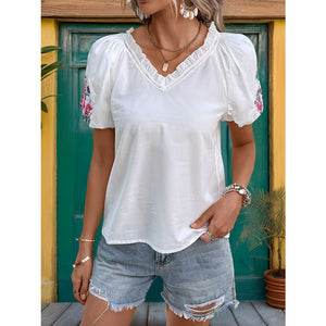 Frill Embroidered V-Neck Short Sleeve Blouse