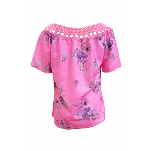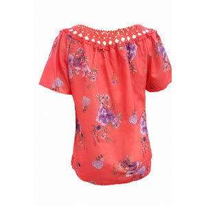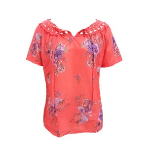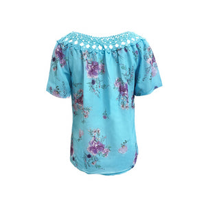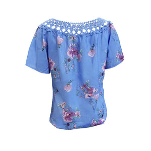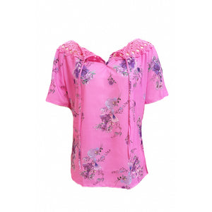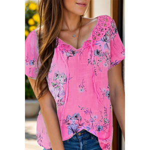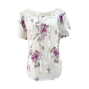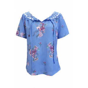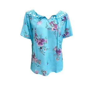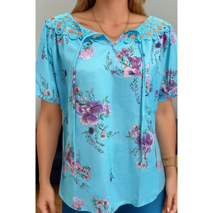 Full Size Printed Tie Neck Short Sleeve Blouse