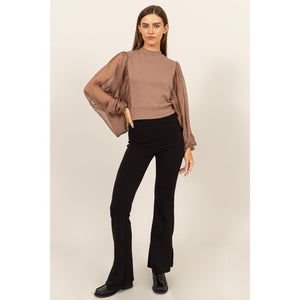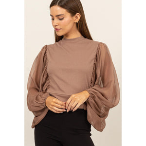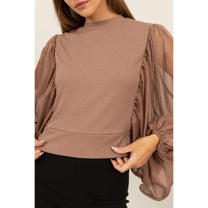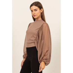 HYFVE Ruched Sheer Long Sleeve Mock Neck Blouse