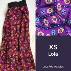 Magenta with orange/olive/black aztec, black waistband, chiffon