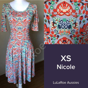 Light blue with dark orange/navy/aqua/cream floral, jersey