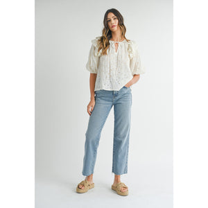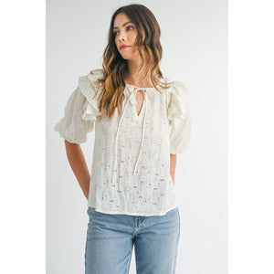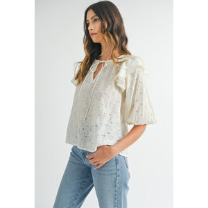 MABLE Eyelet Lace Ruffle Shoulder Puff Sleeve Blouse