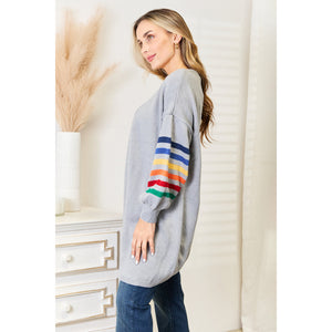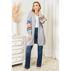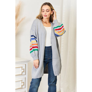 The Multicolored Stripe Open Front Longline Cardigan is a vibrant and eye-catching piece that adds a playful touch to any ensemble. With its longline silhouette and bold multicolored stripes, this cardigan is a perfect choice for layering and creating a fashionable and cozy look.