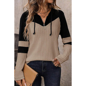 Parchment Textured Colorblock Long Sleeve Quarter Zip Drawstring Hooded Top