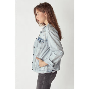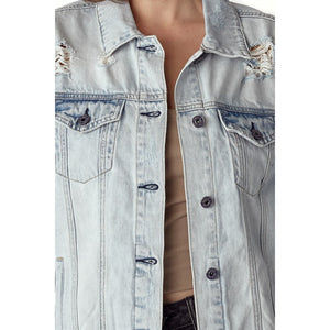 A distressed button-up jacket is a stylish and edgy outerwear piece that features a worn-in and rugged look. Typically made from denim or other sturdy fabrics, this jacket is characterized by distressed detailing such as fraying, rips, or fading to create a vintage and lived-in appearance. The button-up closure adds a classic touch, while the distressed elements give it a modern and urban vibe. This versatile jacket can be layered over a variety of outfits to add a cool and casual feel. Pair it with jeans and a basic tee for a relaxed everyday look, or combine it with a dress for a playful mix of feminine and edgy style. The distressed button-up jacket is a fashion-forward choice for adding a touch of character and personality to your outfit.