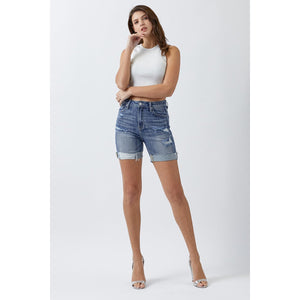 RISEN Full Size Distressed Rolled Denim Shorts with Pockets