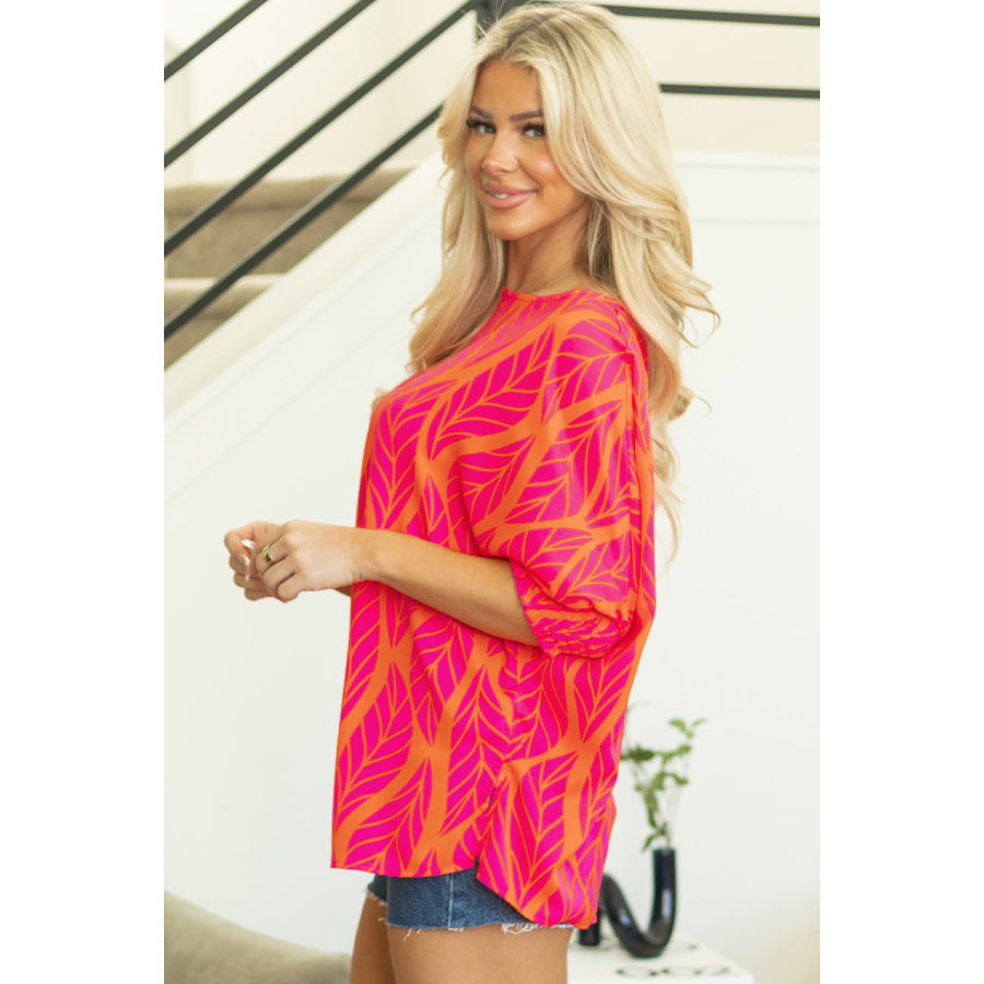 Rose Tropical Leaf Print Smocked Puff Sleeve Blouse