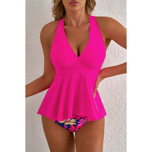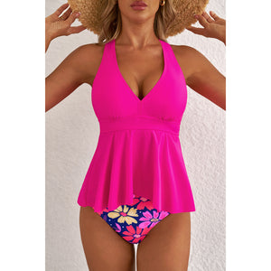 Rose V Neck Ruffled Hem Floral Bottom Tankini Set