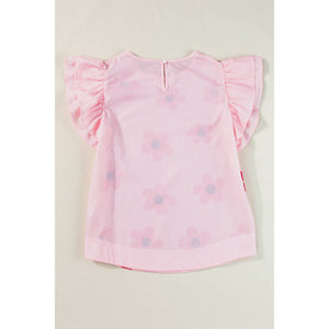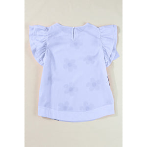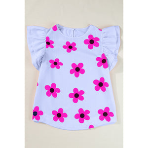 Ruffled Flower Printed Round Neck Cap Sleeve Blouse