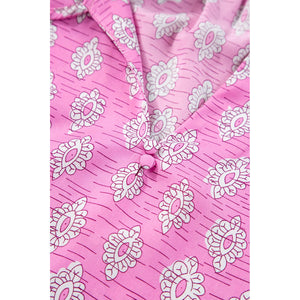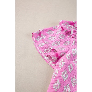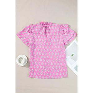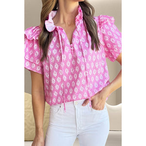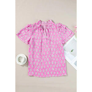 Ruffled Printed Tie Neck Short Sleeve Blouse