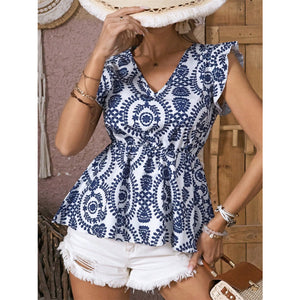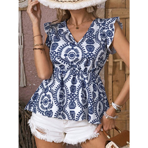 Ruffled Printed V-Neck Cap Sleeve Blouse