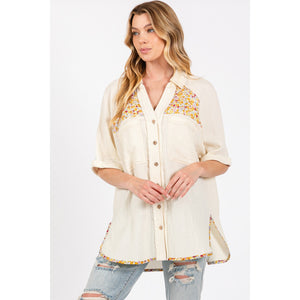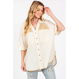 SAGE + FIG Full Size Floral Detail Button Up Short Sleeve Shirt