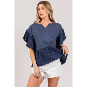 The Ruffle Sleeve Washed Short Sleeves Top is a chic and feminine choice for any occasion. The ruffle sleeve detail adds a touch of elegance and flair to this top. The washed fabric gives it a laid-back and relaxed vibe, perfect for casual outings. With short sleeves, it is ideal for warmer weather or for layering under a jacket. Pair it with jeans for a stylish and effortless look. Elevate your outfit with the charming ruffle sleeves of this washed short sleeve top.