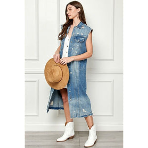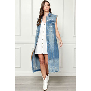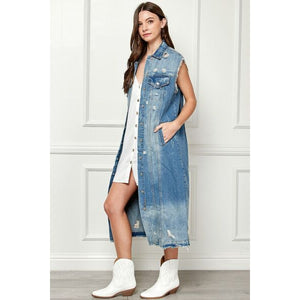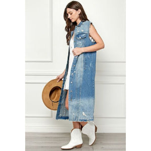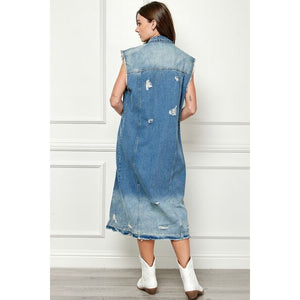 Veveret Full Size Distressed Sleeveless Longline Denim Jacket