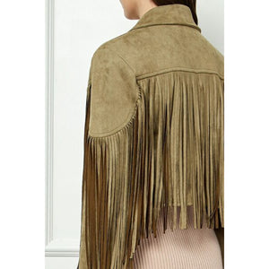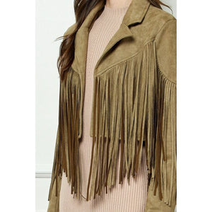 The suede fringe long sleeve moto jacket is the perfect combination of edgy and boho style. The suede fabric gives it a luxurious and texture-rich look, while the fringe details add a playful and free-spirited touch. This jacket is perfect for adding a statement piece to any outfit, whether you're going for a casual or dressed-up look. The moto-inspired design adds a cool and rebellious vibe, making it a standout piece in your wardrobe. With its long sleeves, it is perfect for transitional weather or adding a layer of warmth during chilly evenings. Stand out in style with this unique and eye-catching jacket.