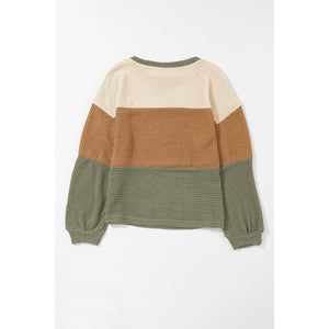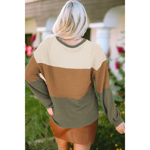 Waffle-Knit Color Block Round Neck Long Sleeve Blouse