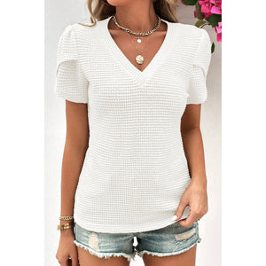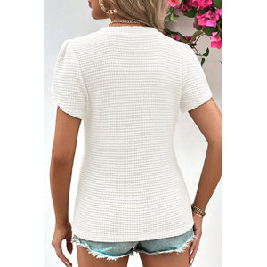Waffle-Knit V-Neck Short Sleeve Blouse