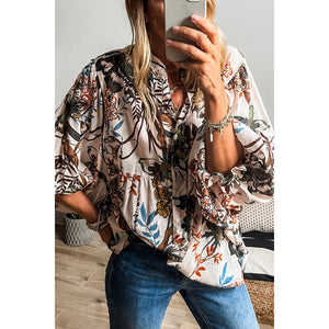White Floral Print Balloon Sleeves Button Up Loose Casual Shirt