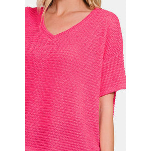 Zenana Drop Shoulder Short Sleeve Jacquard Knit Top