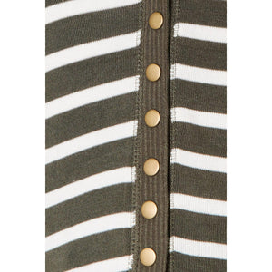 This cardigan features a timeless striped pattern that adds a touch of sophistication to any outfit. The snap button closure not only adds a modern twist to the classic cardigan but also makes it easy to put on or take off.