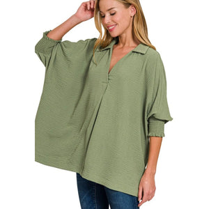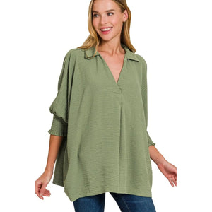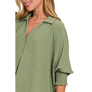 Zenana Airflow Collar Tee with Smocked Sleeve Band Top