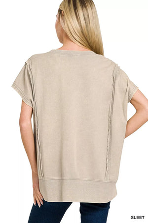 This French terry acid-washed hi-low top combines edgy style with comfort. The acid wash gives it a unique and trendy look. The French terry fabric ensures a soft and cozy feel against the skin. The hi-low hemline adds a modern twist to the classic top design. Elevate your casual look with this fashionable and versatile piece.