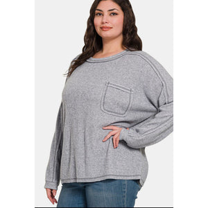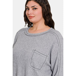 Zenana Full Size Contrast Stitching Brushed Ribbed Hacci Knit Top