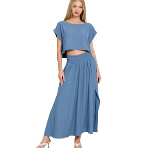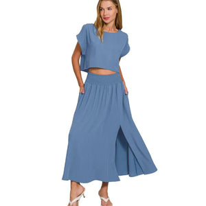 Zenana Heavy Woven Span Crop Tee & Skirt Set
