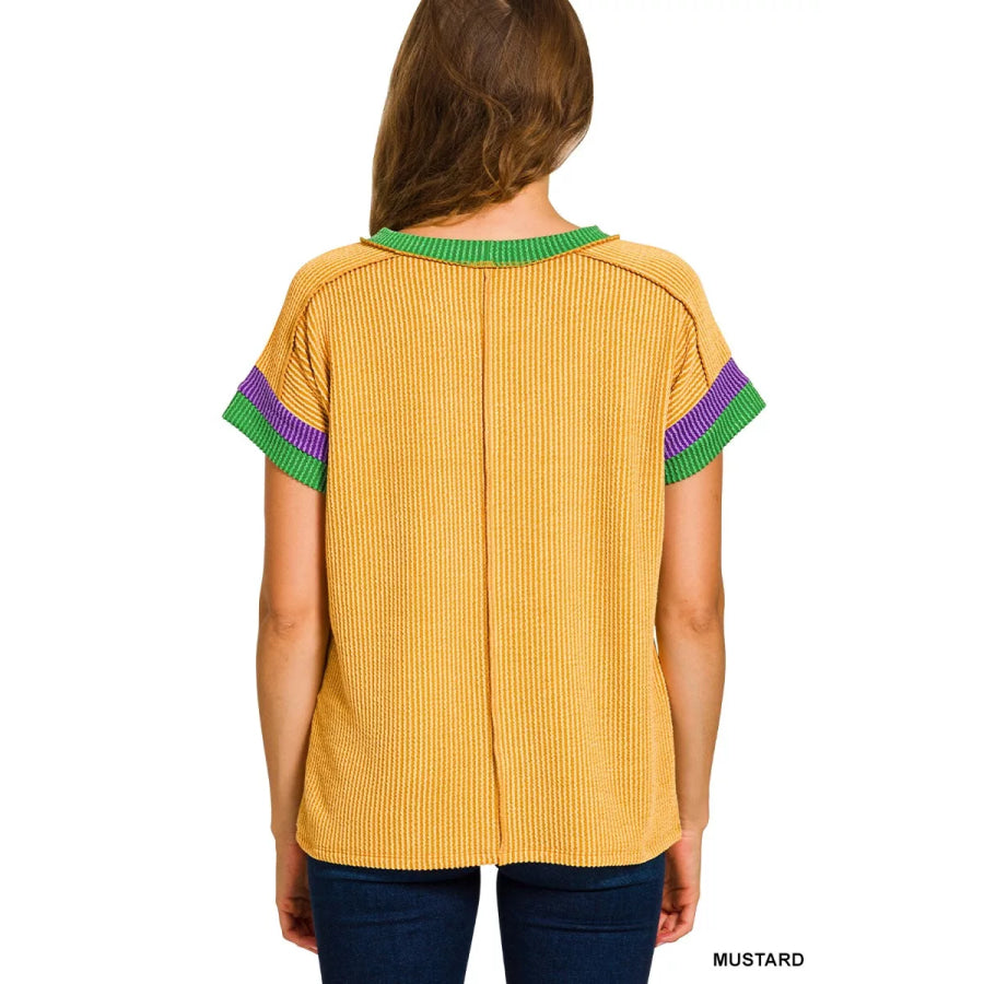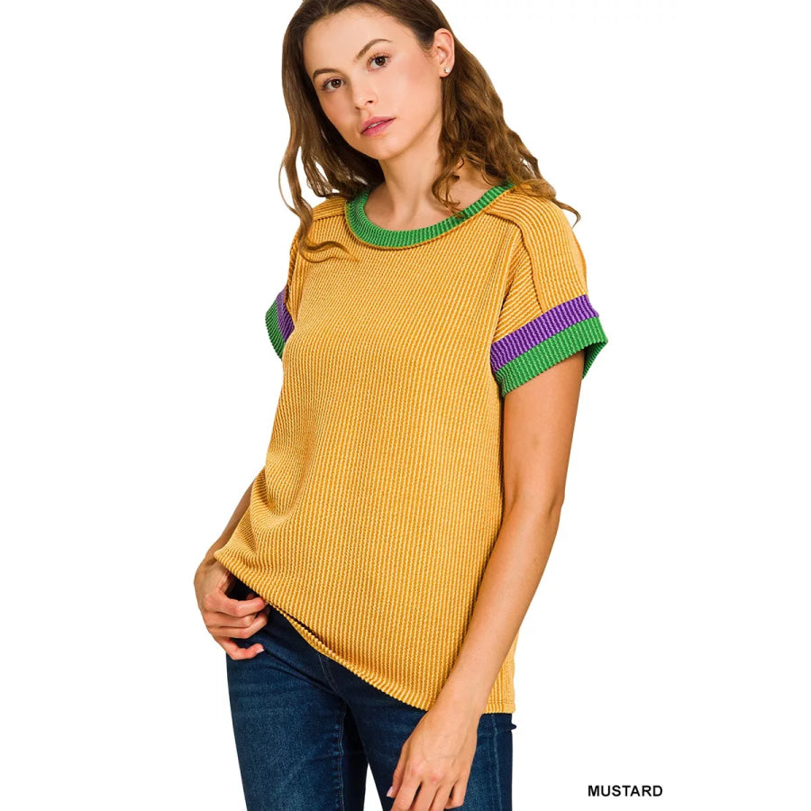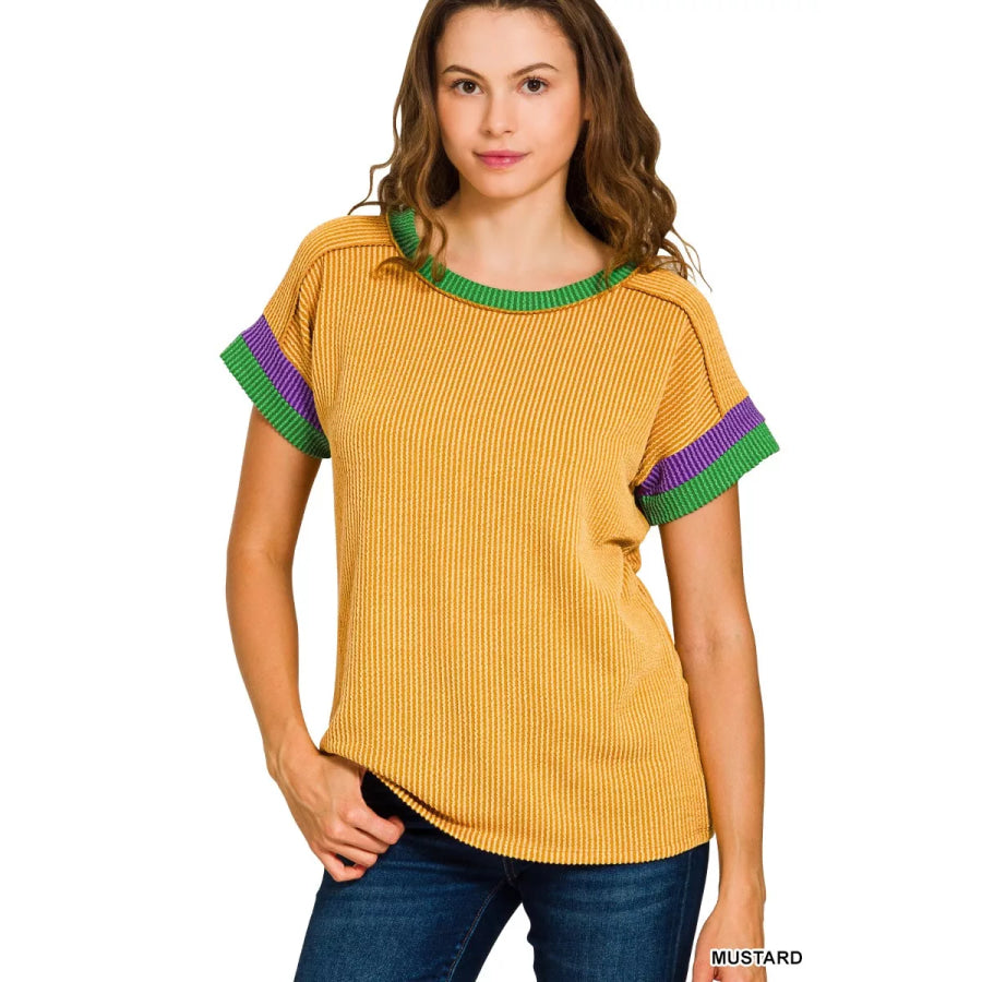 Zenana Mardi Gras Raised Rib Contrast Trim Top