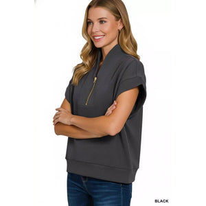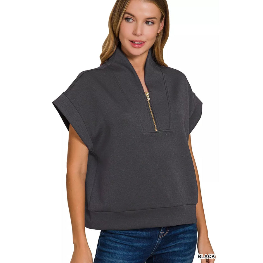 The Scuba High Neck Half Zip Top is a trendy and functional piece that combines style and practicality. Featuring a high neck design, it offers both warmth and a fashion-forward look. The half zip closure adds a modern touch and allows for easy adjustments. Made of scuba fabric, this top has a sleek and structured appearance that pairs well with a variety of bottoms. Whether worn for a casual day out or a sporty activity, this top is a versatile and cool addition to your wardrobe.