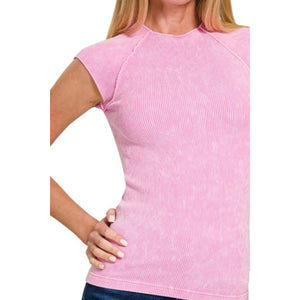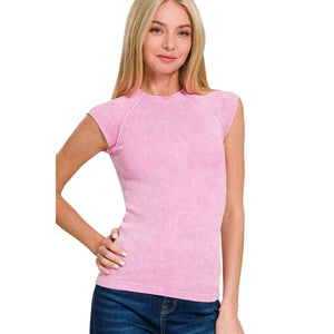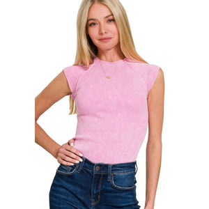 This fashion sleeveless top features a unique acid wash treatment in a beautiful lavender blue shade. The ribbed texture adds interesting detail while providing a flattering fit. Made from a soft, stretchy cotton blend material that ensures both comfort and durability. The cap sleeve design and crew neckline create a classic silhouette that can be dressed up or down. Perfect for casual everyday wear or as a layering piece. The form-fitting style accentuates the body's natural shape while remaining comfortable throughout the day. Ideal for spring and summer wardrobes.