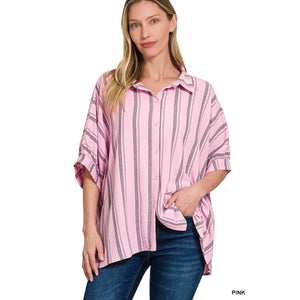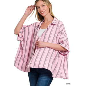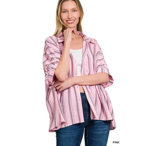 Zenana Woven Yarn-Dye Stripe Oversized Button Down Shirt