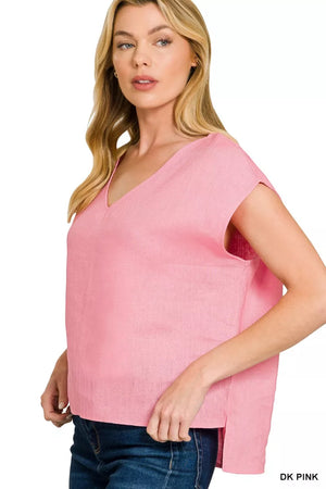 The Linen V-Neck Sleeveless Top is a breezy and chic addition to your warm-weather wardrobe. Made from lightweight linen fabric, this top is perfect for staying cool and comfortable on hot days. The V-neckline adds a touch of elegance and flatters the neckline. The sleeveless design allows for easy layering or wearing on its own. Elevate your summer style with this versatile and timeless linen top that can be dressed up or down effortlessly.