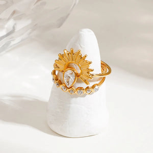 3 Piece Stainless Steel Rhinestone Sunburst Crown Ring