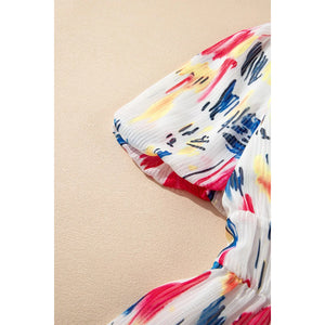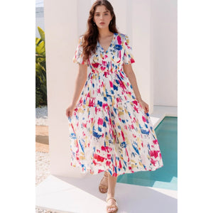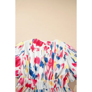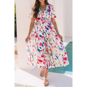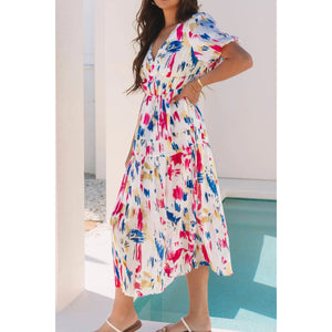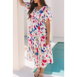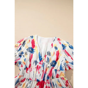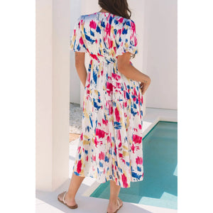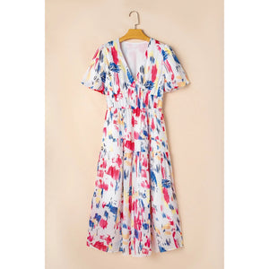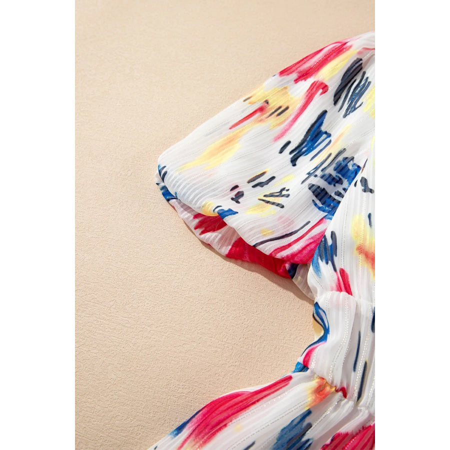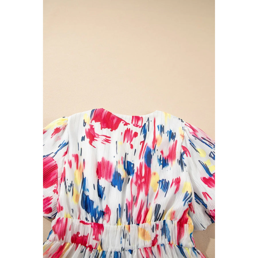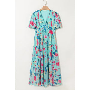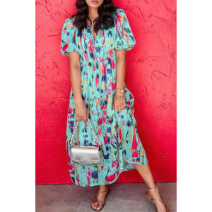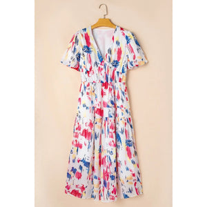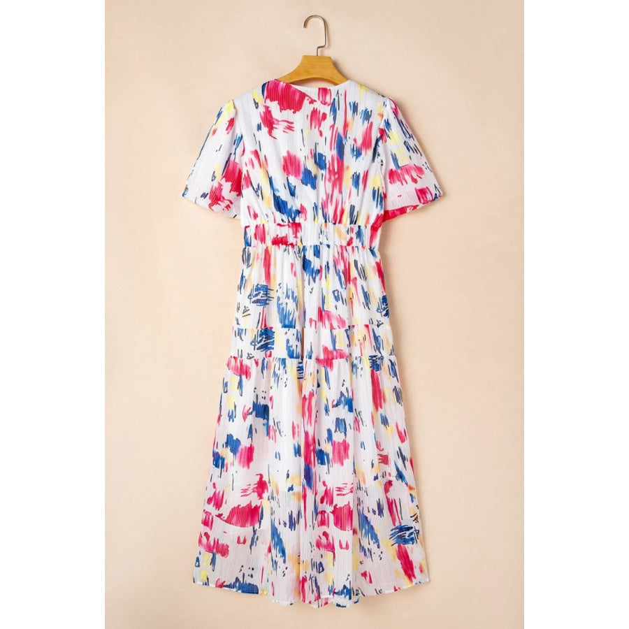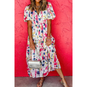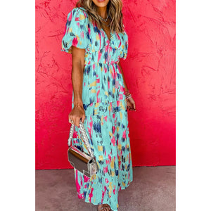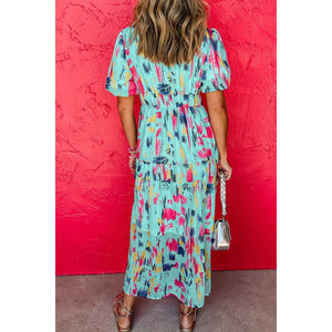 Abstract Print Short Puff Sleeve Tiered Maxi Dress