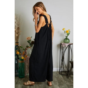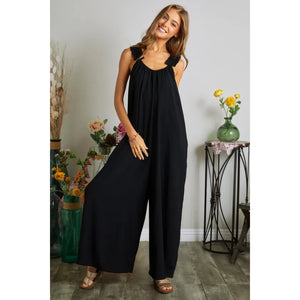 The elastic ruffle shoulder jumpsuit is a stylish and versatile piece for your wardrobe. The elastic ruffle shoulders add a feminine and on-trend touch to the jumpsuit. The elastic waist creates a flattering and comfortable fit. This jumpsuit is perfect for various occasions, offering a chic and effortless look. Pair it with heels and statement jewelry for a night out or dress it down with sneakers for a more casual vibe. The ruffle shoulder detail adds a playful and elegant touch to the overall ensemble.