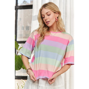 The Multi Color Stripe Casual Top is a fun and colorful addition to your everyday wardrobe. With its striped design featuring multiple colors, this top offers a playful and vibrant look. The casual style makes it perfect for pairing with jeans, shorts, or leggings for a relaxed and laid-back outfit. Whether you're running errands, meeting up with friends, or just enjoying a leisurely day, this top will add a cheerful and stylish touch to your ensemble.