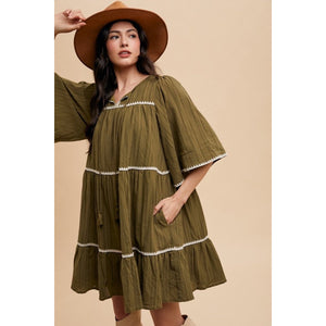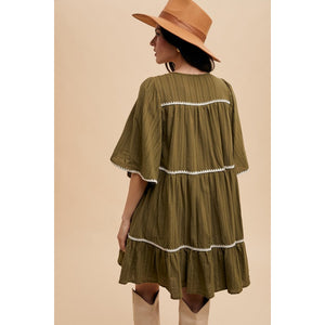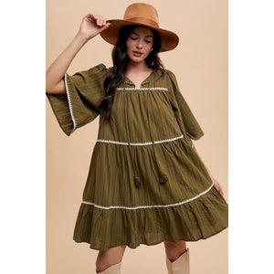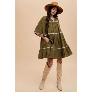 Annie Wear Tassel Contrast Trim Tie Neck Half Sleeve Tiered Dress