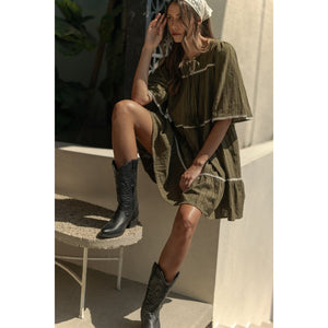 The Tassel Contrast Trim Tie Neck Half Sleeve Tiered Dress is a charming and stylish garment that combines several fashionable elements. The dress features tassel accents and contrast trim details, adding a bohemian and playful touch to the design. The tie neck creates a chic and adjustable neckline, while the half sleeves offer a flattering and versatile look. The tiered construction of the dress adds volume and movement, giving it a feminine and flowy silhouette. Perfect for a variety of occasions, this dress is both fashionable and comfortable, making it a versatile choice for your wardrobe.