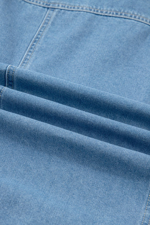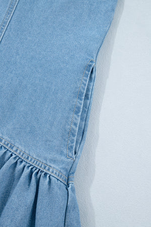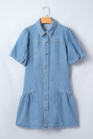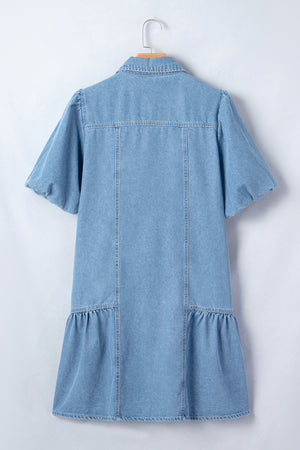 Beau Blue Button Down Short Puff Sleeve Ruffle Hem Patchwork Denim Dress