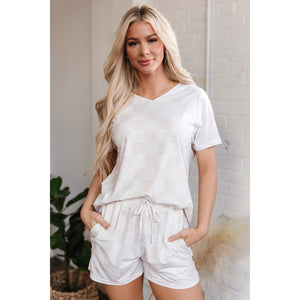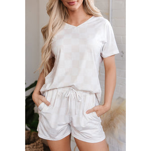 Beige Checkered V Neck Tee Drawstring Shorts Lounge Set