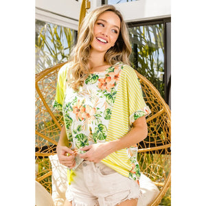 This top features a unique combination of floral print and striped color block design on dolman sleeves, creating a stylish and eye-catching look. The floral pattern adds a touch of femininity and charm, while the striped color block detailing brings a modern and dynamic element to the top. The dolman sleeves provide a relaxed and comfortable fit, perfect for everyday wear. Elevate your outfit with this trendy and versatile top that effortlessly blends floral elegance with bold stripes for a fashion-forward ensemble.