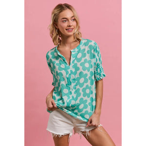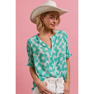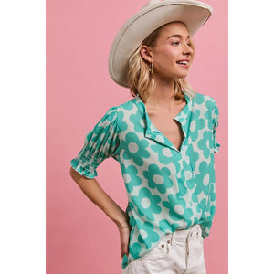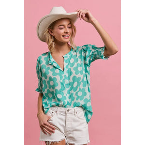 BiBi Flower Printed Woven Smocking Sleeves V Neck Top