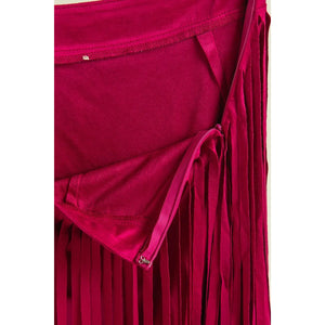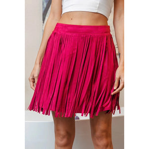 This suede skirt is detailed with fringe accents for a bohemian-inspired look. The fringe adds movement and texture to the skirt, creating a unique and eye-catching style. Perfect for adding a touch of Western flair to your outfit, this skirt can be dressed up with heels or styled casually with boots for a trendy ensemble.