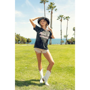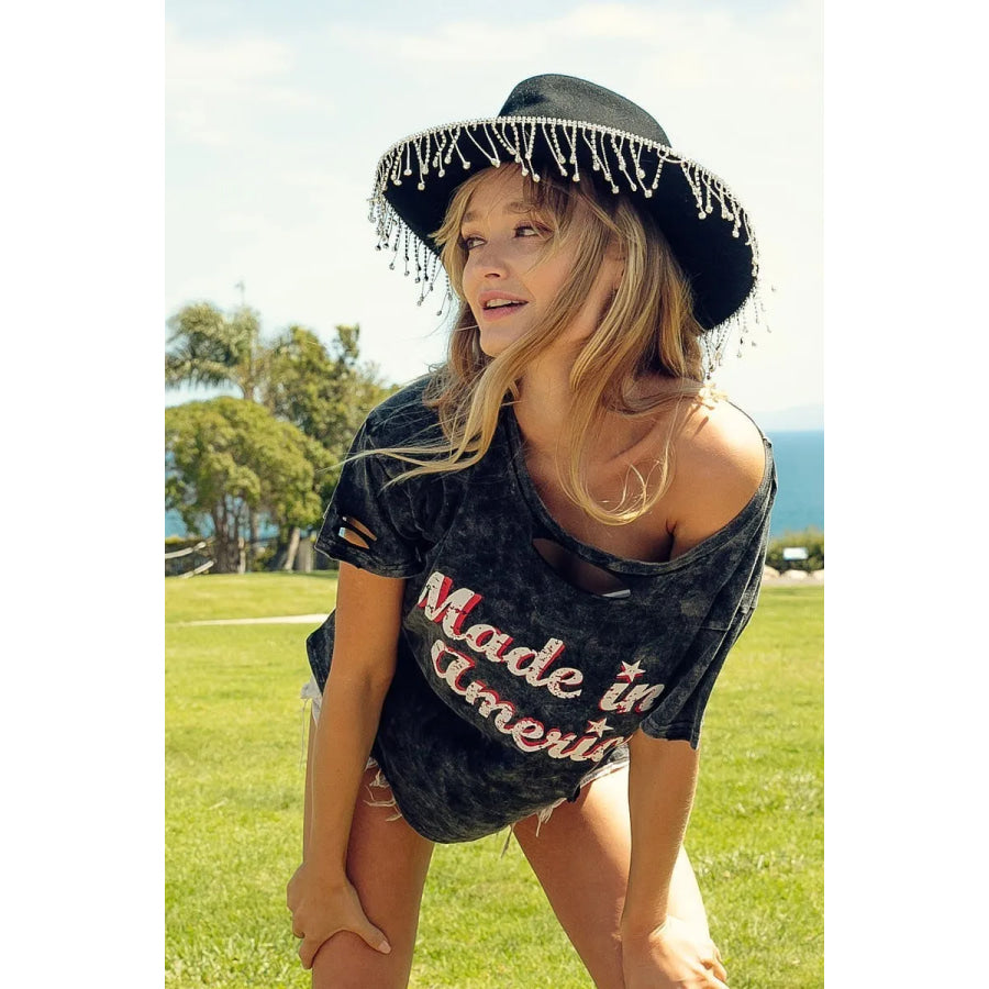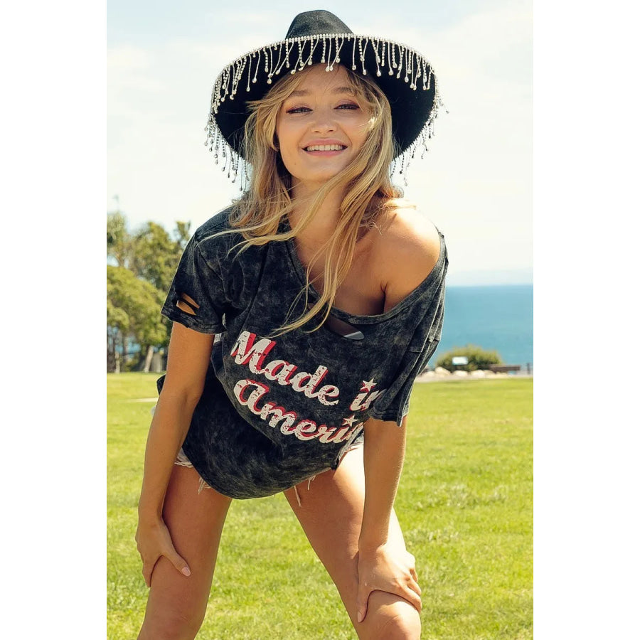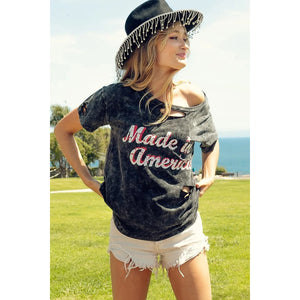 This America print top features a laser-cut design on mineral washed fabric, giving it a unique and stylish look. The America print adds a patriotic touch, perfect for celebrating national holidays or showing your pride year-round. Made from high-quality materials, this top is both comfortable and fashionable. Stand out with this trendy and eye-catching laser-cut mineral washed America print top!