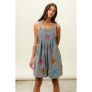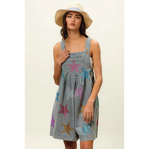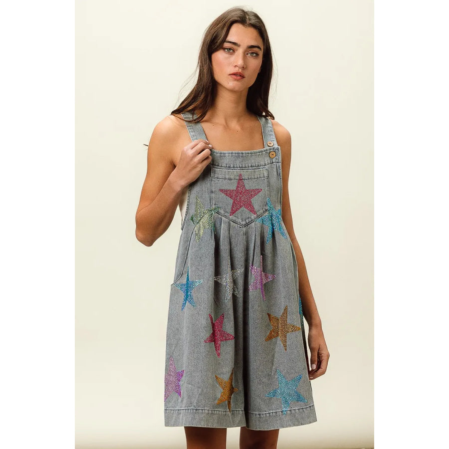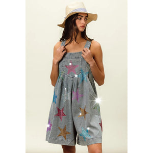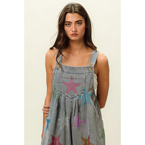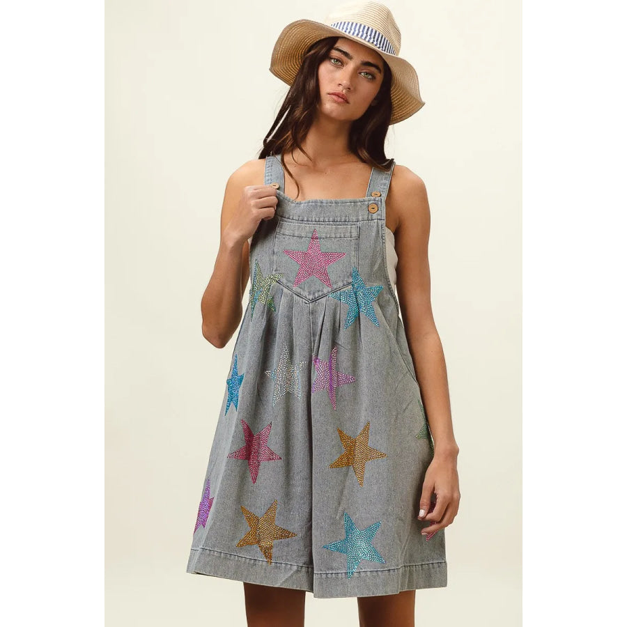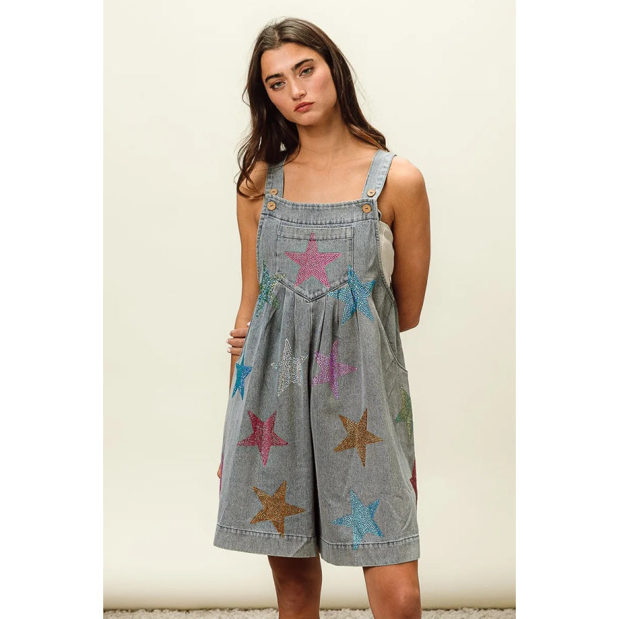 BiBi Star Rhinestone Washed Wide Leg Shortalls