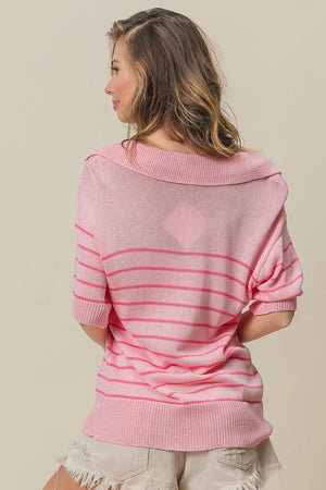 BiBi Stripe Short Sleeves Collared V Neck Top